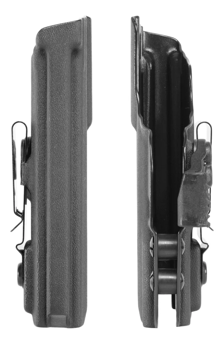 Com clip de metal resistente, compatível com cintos de até 45 mm, e ajuste de altura, o coldre adapta-se facilmente às preferências do usuário, promovendo estabilidade e conforto durante todo o dia.
