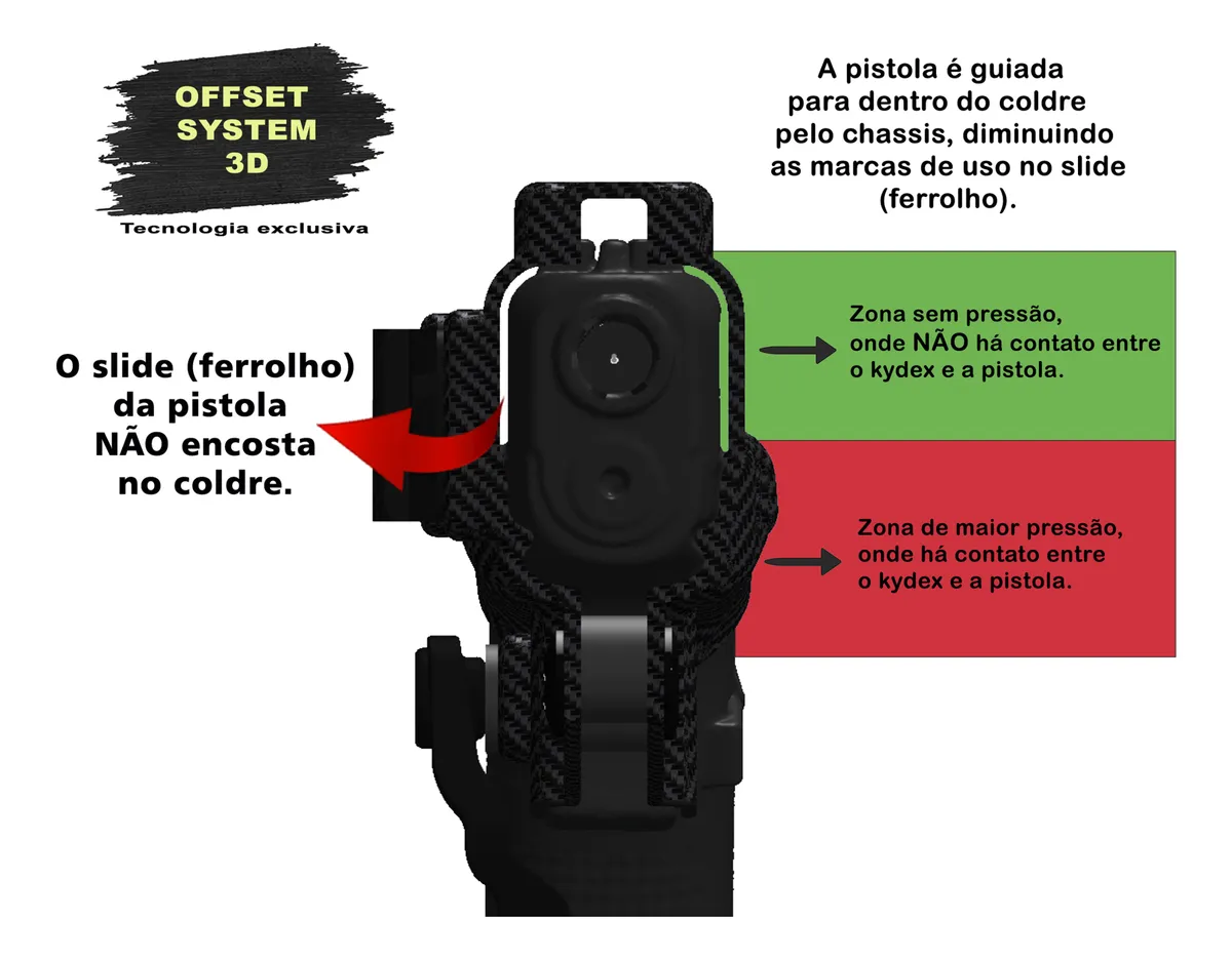 Produzido com Kydex original importado dos EUA, material reconhecido por sua resistência e durabilidade, o coldre conta com tecnologia que mantém poucos pontos de contato com a arma, evitando desgastes e riscos.