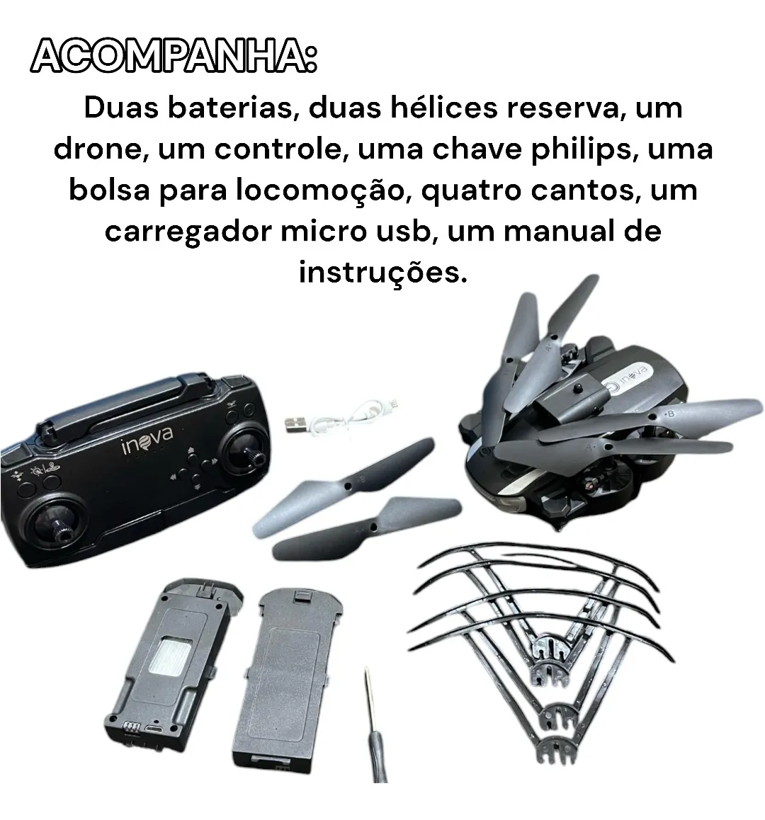 Ideal para uso recreativo, profissional e criativo, o Drone Inova transforma qualquer voo em uma experiência visual inesquecível.