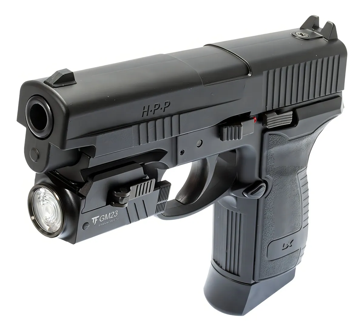Seu corpo é fabricado em alumínio anodizado de alta resistência, garantindo leveza e durabilidade mesmo em condições adversas. Compacta e fácil de acoplar, a GM23 foi projetada para pistolas, proporcionando firmeza e estabilidade sem comprometer o equilíbrio da arma.
